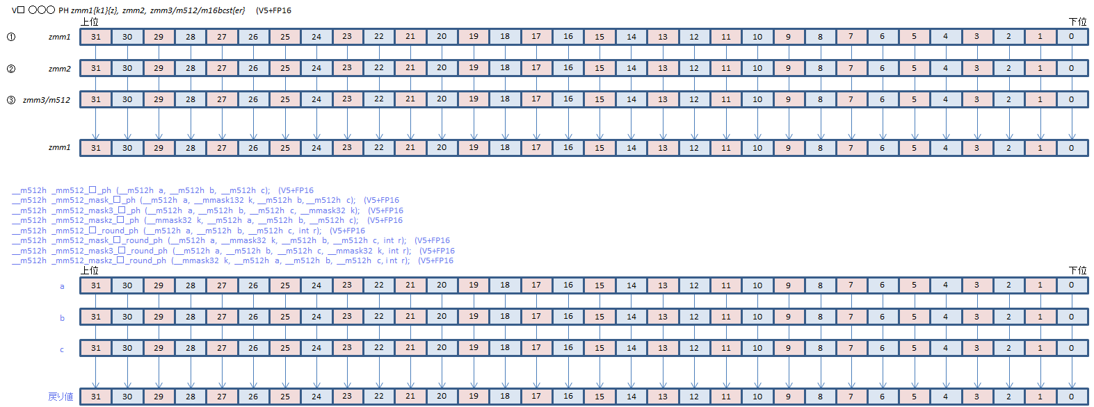 | FMADD | VFMADD132PH | ①*③+② | |