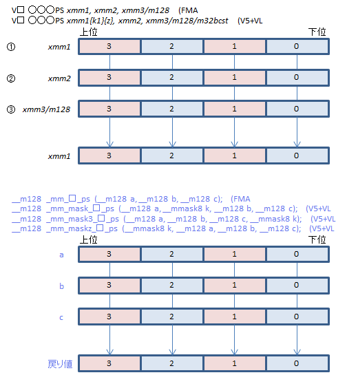 どれとどれを掛けてどれを足す/引くかは命令名の数字(123)の並び順で決まる。intrinsicsでは引数の並び順で決まる。