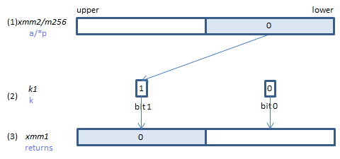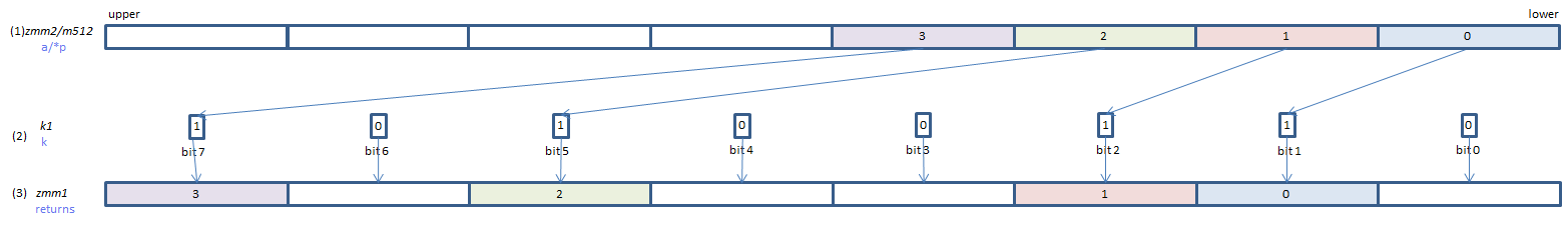 If each bit of (2) is set, the corresponding element of (3) is copied from (1), taken one by one from the lowest element.