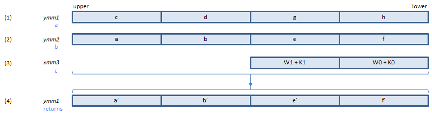 The updated state variables c', d', g', h' are not returned by this instruction, because they are equal to the input data (2) (the state variables a, b, e, f before the 2 rounds).