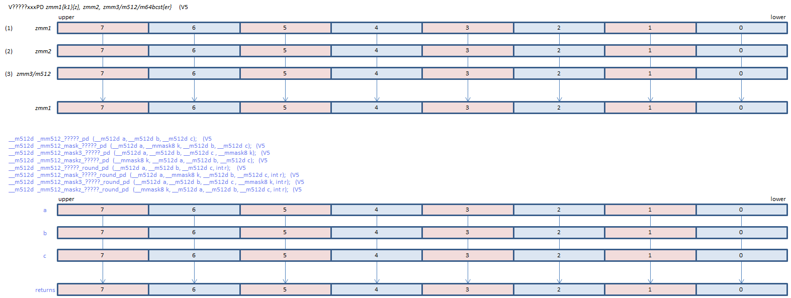 | FMADD | VFMADD132PD | (1) * (3) + (2) | |