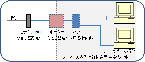 家の回線に2台以上の機器を有線でつなぐには、交通整理役の「ルーター」と、口を増やす「ハブ」が必要です。