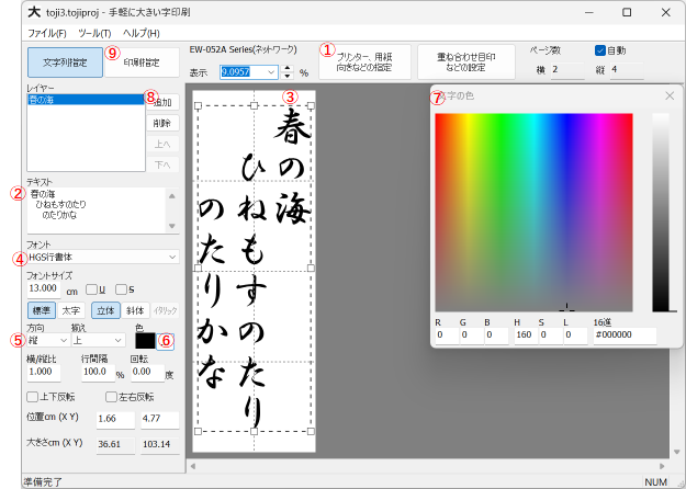 複数の紙にまたがるような大きい字を印刷するだけのプログラムです。印刷した紙を切り貼りすることで1枚の大きい紙のようにすることができます。
