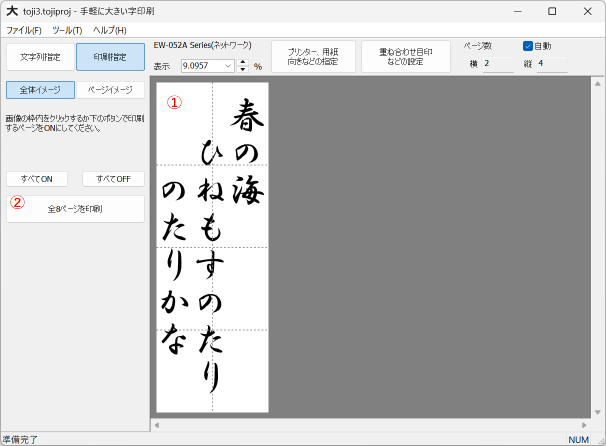 ①各ページに印刷される部分が点線で仕切られて表示されます。(上の図はA4縦のページが縦に4段、横に2列、合計8ページが並んでいる状態です)。各ページをクリックして印刷する、しないを切り替えることができます(印刷しないページはくすんだ色で表示されます)。