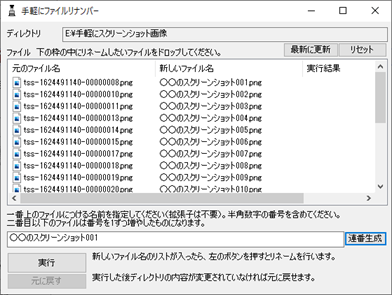 姉妹品「手軽にファイルリナンバー」でお好みの形式の連番ファイル名に付け直すことができます。 保存したいスクリーンショット画像だけを選んで付け直すこともできます。 |