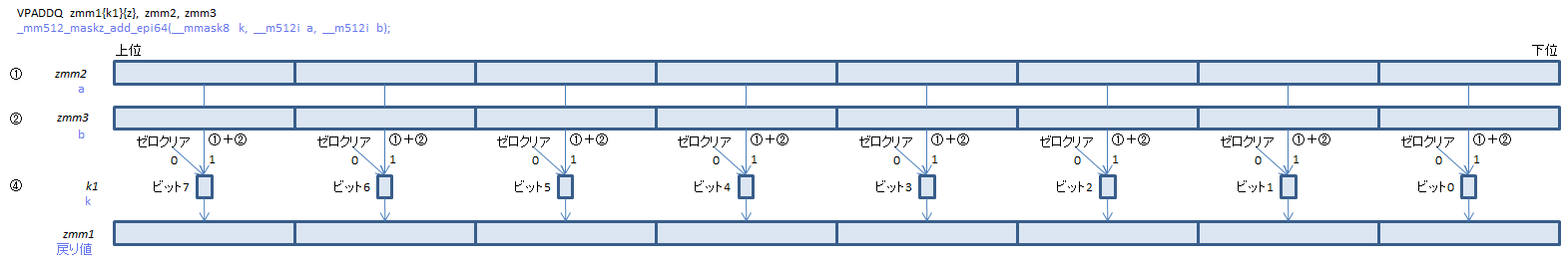 intrinsicsでは__mmask8、__mmask16、__mmask32、__mmask64型変数を使用します。