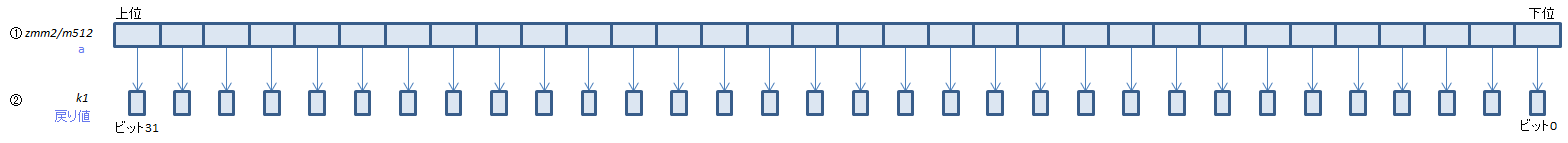 k2のビットが0の要素はチェックされず②の対応するビットは0になる。②の上位ビットは0クリアされる。