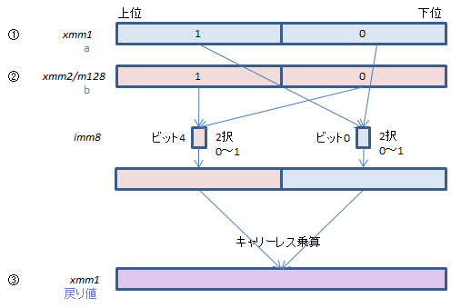 各レーンについて①と②からひとつずつQWORDを選択し、選択されたQWORDをキャリーレス乗算した結果を③にセットする。両レーンでimm8の同じビットを使用