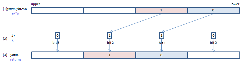 If each bit of (2) is set, the corresponding element of (3) is copied from (1), taken one by one from the lowest element.
