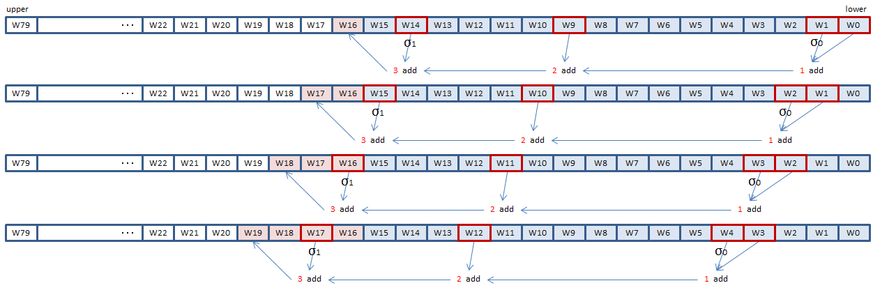 The expression of A is the calculation of QWORD values to be appended to the pre-processed 16-QWORD message block, to generate the 80-QWORD W array.