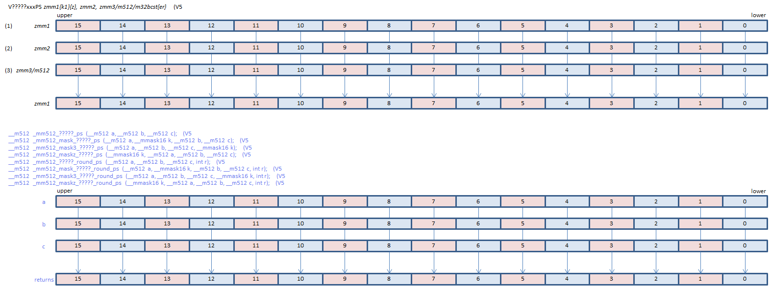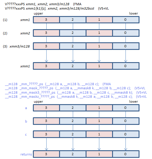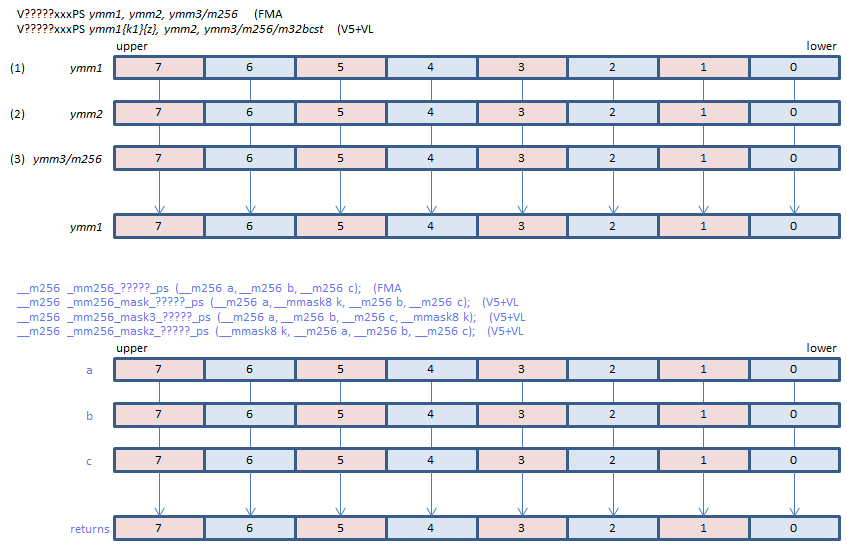 | FMADD | VFMADD132PS | (1) * (3) + (2) | |